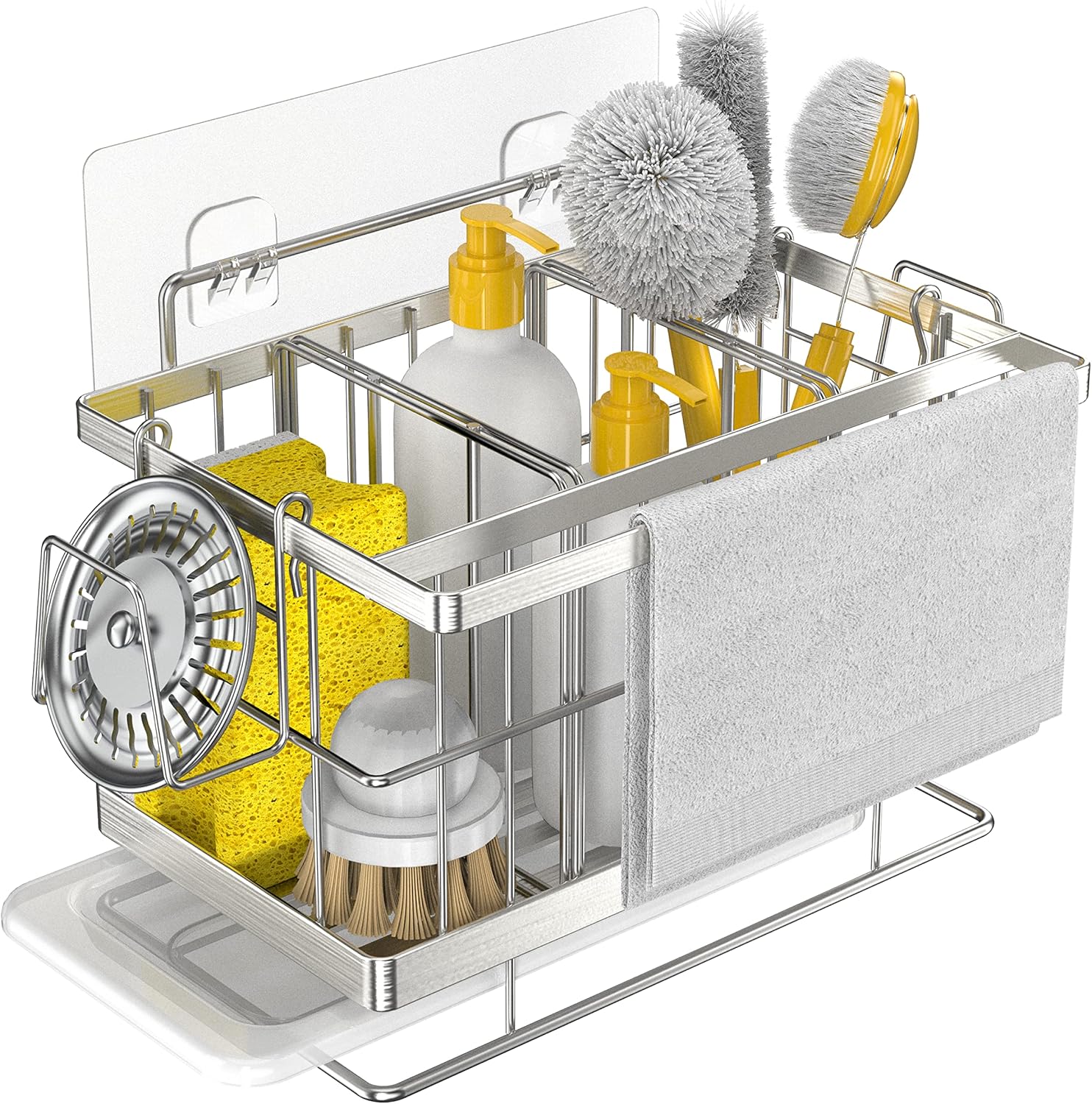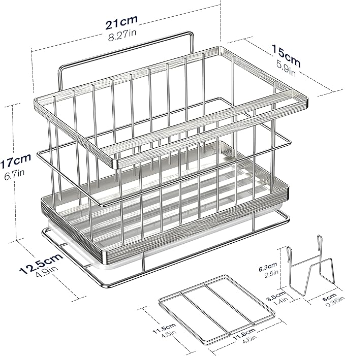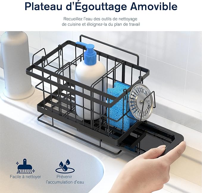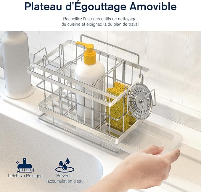 Le bac d’égouttement amovible facilite le nettoyage et protège le comptoir de l’humidité. Livré avec organisateur, crochets, séparateurs et adhésifs.