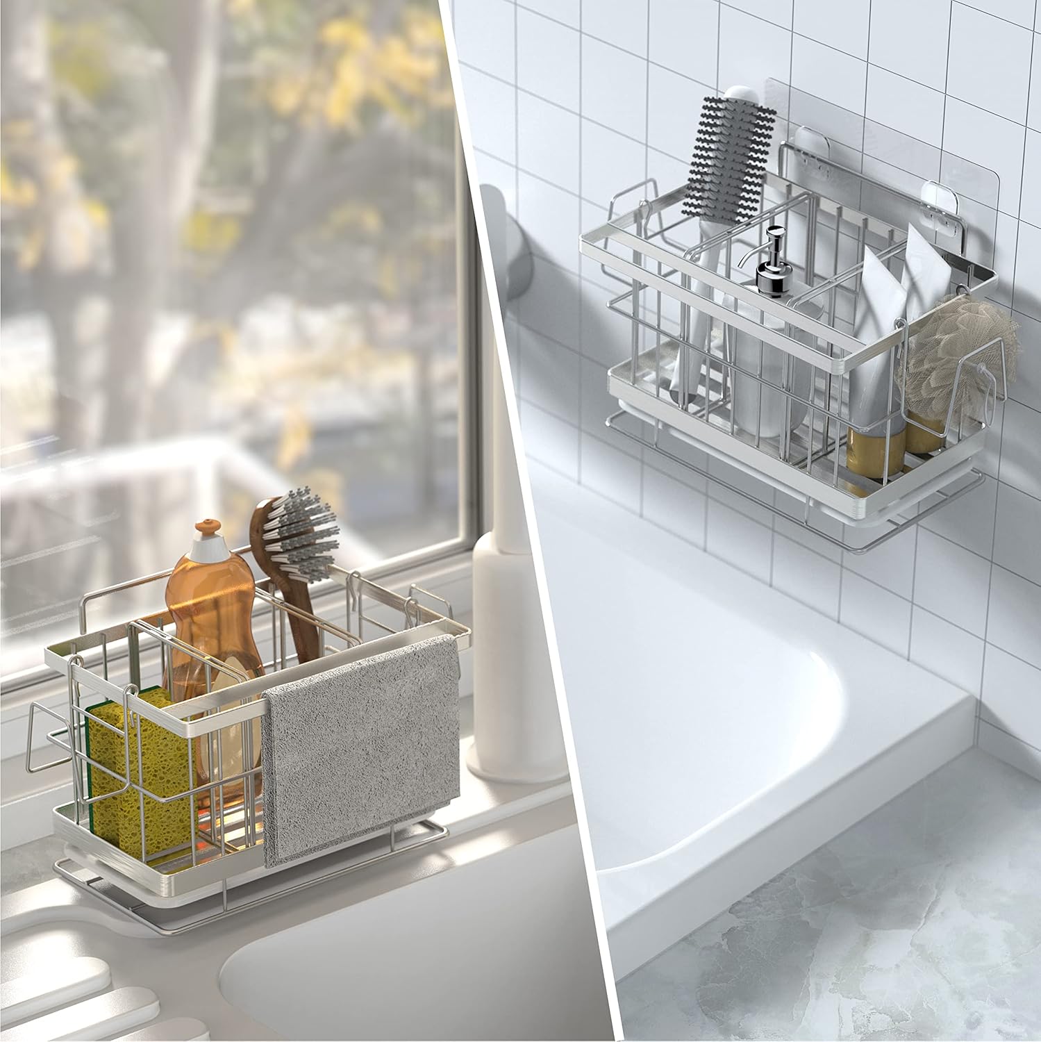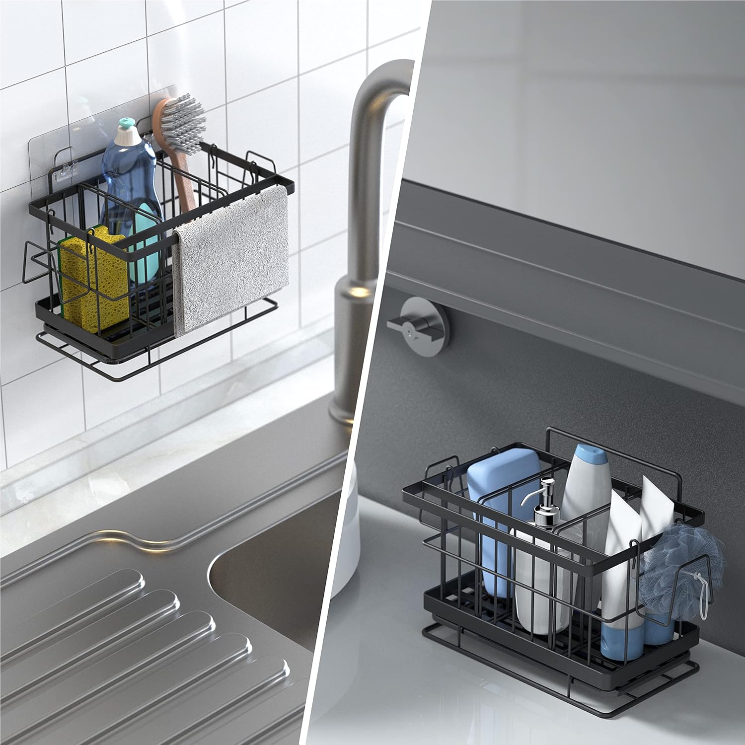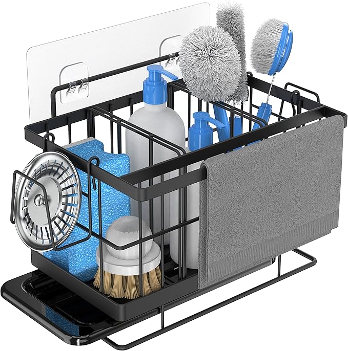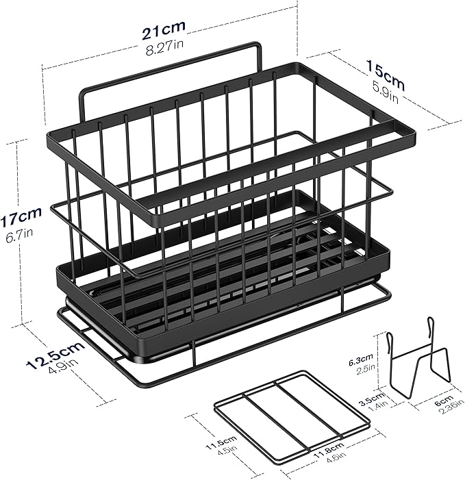 Idéal pour ranger éponges et accessoires aussi bien dans la cuisine que sur le comptoir de la salle de bain, finition noire élégante.