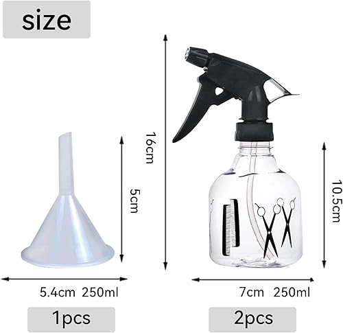 Le pack comprend 2 flacons pulvérisateurs de 250 ml et un entonnoir de 50 ml. Les flacons transparents avec buse noire offrent une capacité idéale pour un usage quotidien.
