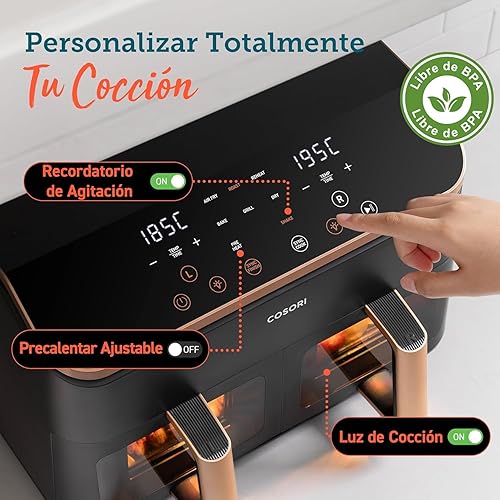 Cosori CAF-R903 est une friteuse à air numérique à double panier de 8,5 L, offrant une grande capacité et huit fonctions en un seul appareil. Elle propose une plage de température de 35 à 230 °C, une fenêtre de contrôle intégrée, ainsi que l’accès à des recettes en ligne pour enrichir vos préparations.