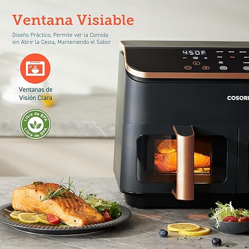 La friteuse à air double panier numérique COSORI offre une capacité généreuse de 8,5 L avec une fonction 8-en-1 polyvalente. Elle permet une cuisson précise entre 35 et 230 °C, intégrant une fenêtre pour une surveillance facile des aliments.