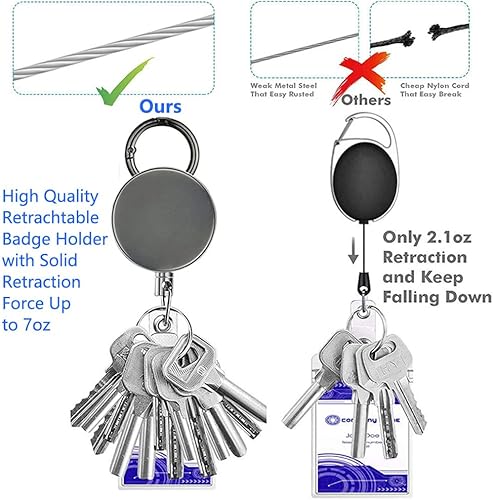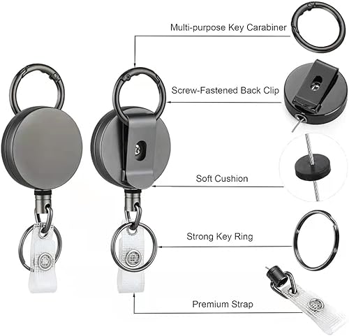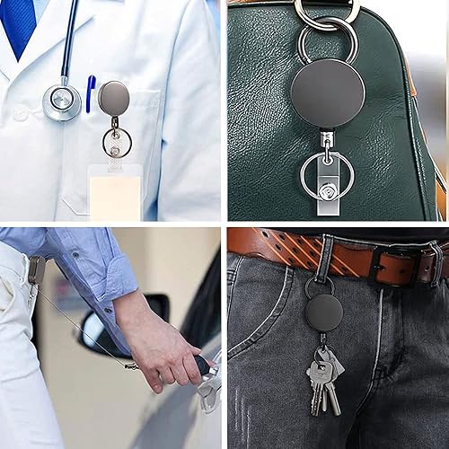 Enrouleur de badge rétractable polyvalent : ce porte-clés rétractable est conçu pour accrocher non seulement des clés et des cartes d’identité, mais aussi divers petits outils tels que pinces, coupe-ongles, couteaux de poche, tournevis, décapsuleurs et autres instruments multifonctions.